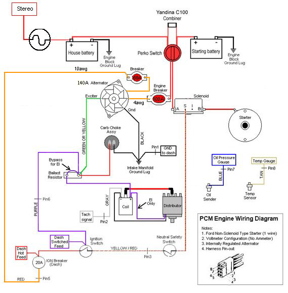 - The diagram that I drew doesnt necessarily show the physical connections- its a schematic of sorts. If you want to run 2 wires off of the alt (1 to each breaker, both should be 2awg) thats fine- but it would be easier to run one to a single breaker and a shorter wire to the second breaker, assuming theyre mounted close together at the rear of the engine. Same goes for the wiring to the Perko- its only necessary that the 100A breaker go between the batteries and 4awg coming from the alt, and that the Perko be installed between the solenoid and 2 batteries. Just remember that all of those wires should be 0awg since theyre on the unprotected side of the breakers. Shorter runs are better than longer ones- theres less voltage drop, and the wire is expensive!