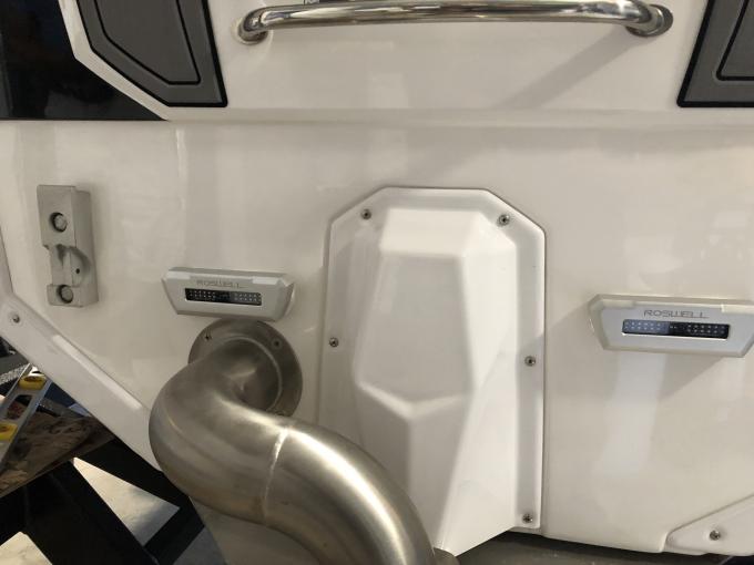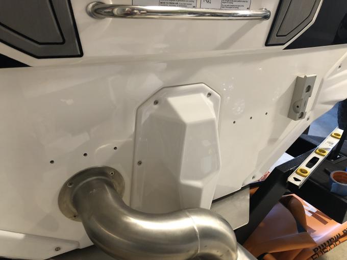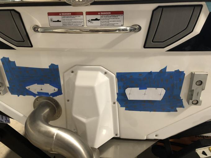 I ended up 8" down from the edge of the black gel coat and 8" over from the swim deck bracket to the center hole. I tested location with a 1/8" drill bit and then once all was confirmed drilled out with a 5/16" drill bit. All was masked and I ran the bits in reverse going through the gelcoat. Once done I used a dremel stone one the edges to taper the gel coat and hopefully keep it from cracking over time. (all per the instructions from Roswell).