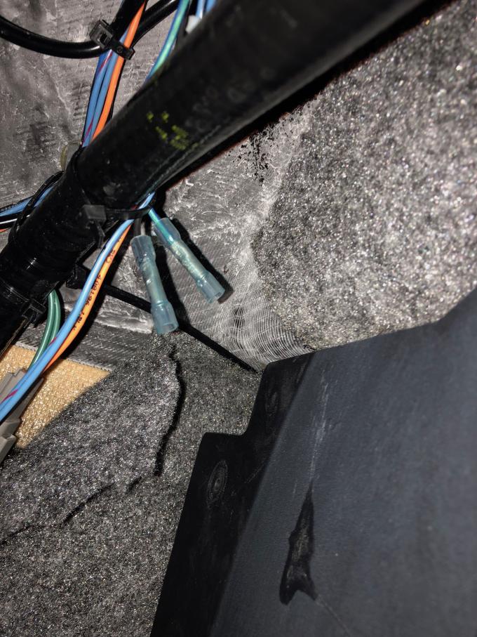 Facing the engine, the wire bundles are tucked up in each corner. There is a blue and black wire with butt connectors already in place ready for the transom lights and control through your linc display.