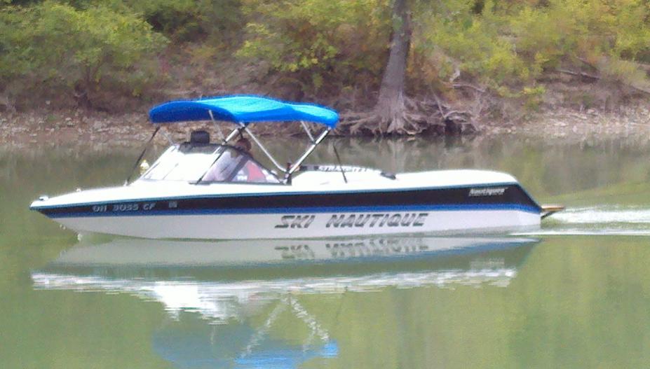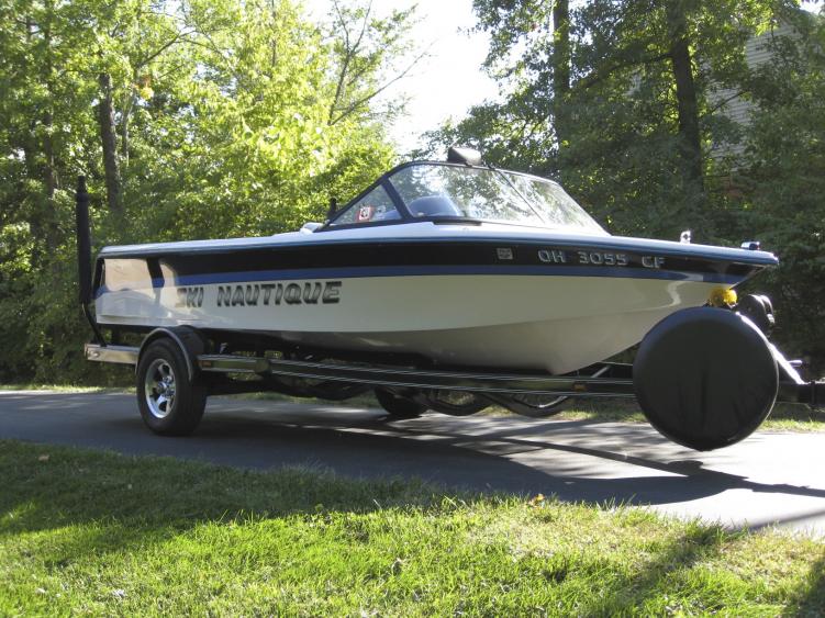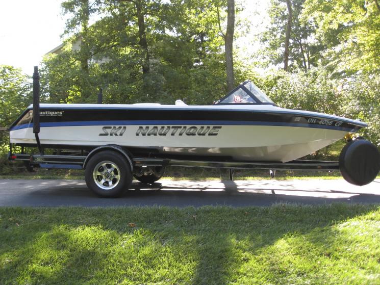 1995 Ski Nautique 196, excellent condition, beautiful white hull with black main stripe and blue accent stripe. New in 2009 Boatmate trailer with swing-away tongue.