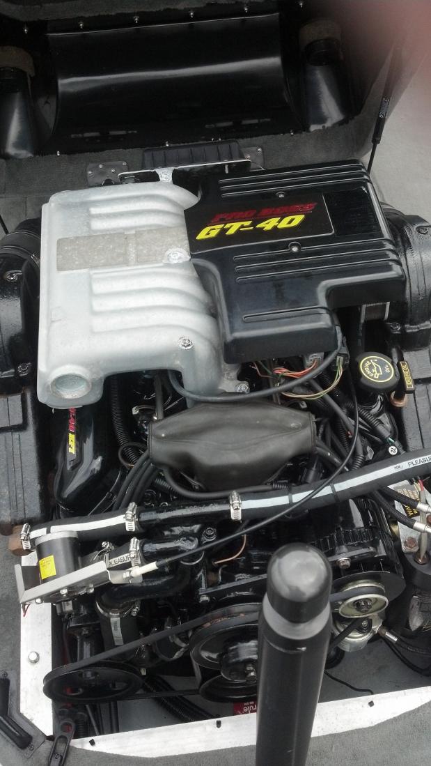 5.8L GT40 325hps, with 642 hrs , Fresh water use only, inside/outside wiped down every time after using, never left in water over night, always stored inside, boat looks in new condition, always get complements, Perfect Pass Speed Control, Bimini Top, New items: Steering cable, Kenwood Marine AM/FM/CD/iPod/USB Stereo, four Polk Audio marine speakers, Glove Box Strut, Boat Cover with side skirts, and covers swim platform, front seat bottoms