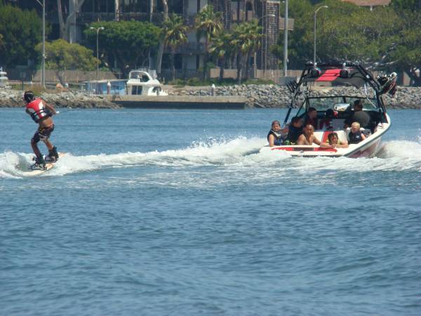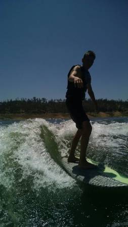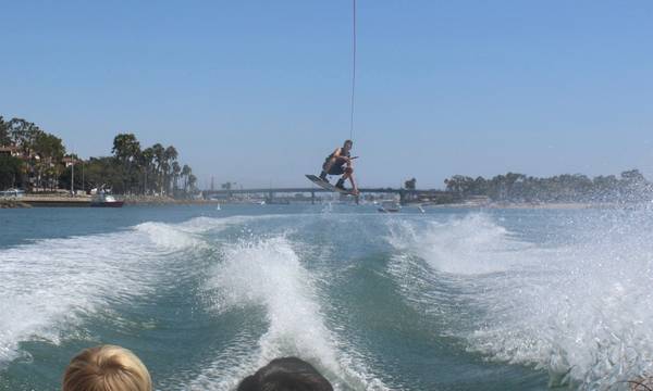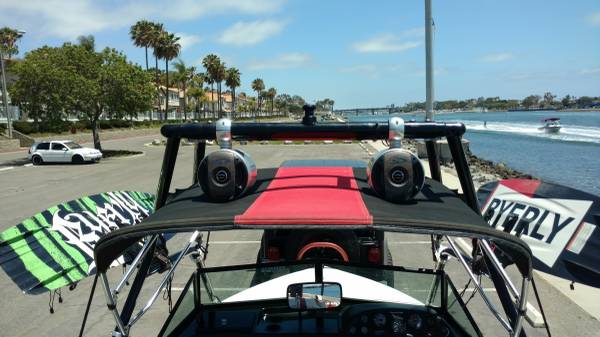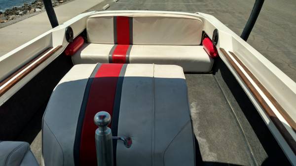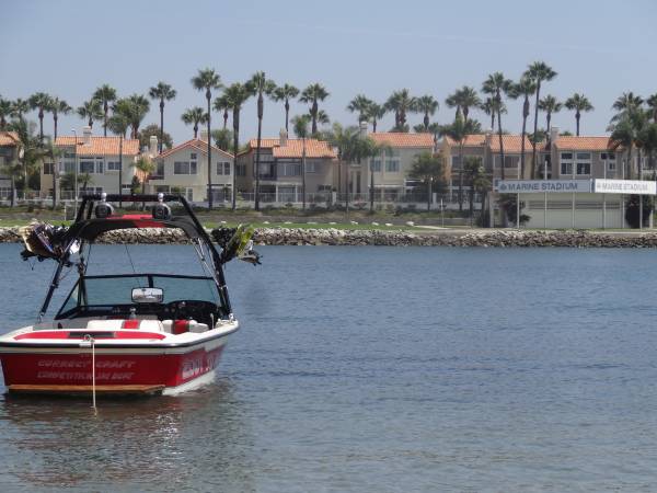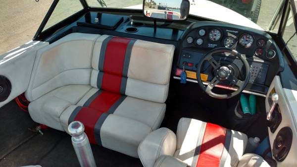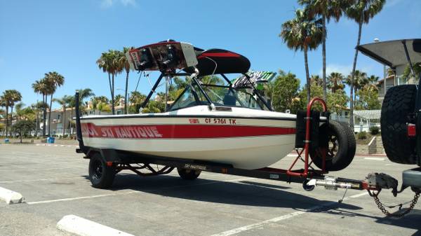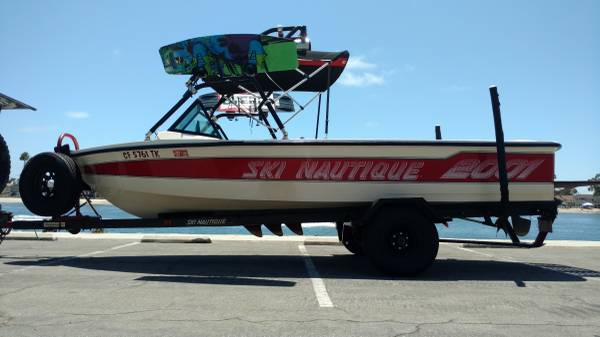 1988 Correct Craft Ski Nautique 2001. 19 feet, 351 PCM engine (240 hp, 934 hours), ACME 542 propeller, original factory single axle trailer all in great condition. Salt and freshwater boat cared for meticulously every outing (quick-connect installed for flushing motor). Custom stereo with a subwoofer and folding Air Boom tower with 2 tower speakers, a custom bimini top, and removable wakeboard racks. Dual batteries with battery switch. Vinyl seats/upholstery and teak swim platform in good shape. Great underrated wake. We've been able to do inverts and raleys like on any other wakeboard boat, but it's also the perfect boat to learn the basics. We've also been able to wake surf with extra weight. Wake skating is fun to do on this boat as well, and of course it's a great boat for skiing.