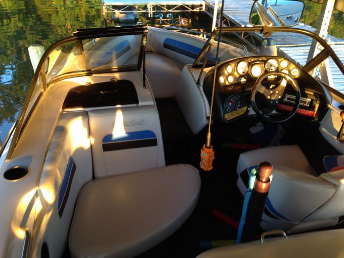 2nd owner. Boat is in Great Shape, drives, runs great. It is an excellent cross over boat. We used mainly for slalom skiing 32-34 mph and kids skiing 17.5 mph and slower, however it delivers a great wake boarding wake at wake boarding speeds. Well maintained with oil changed yearly, transmission fluid changed every 100 hrs, and new impellor every other yr. Waxed and cleaned at the end of every season.