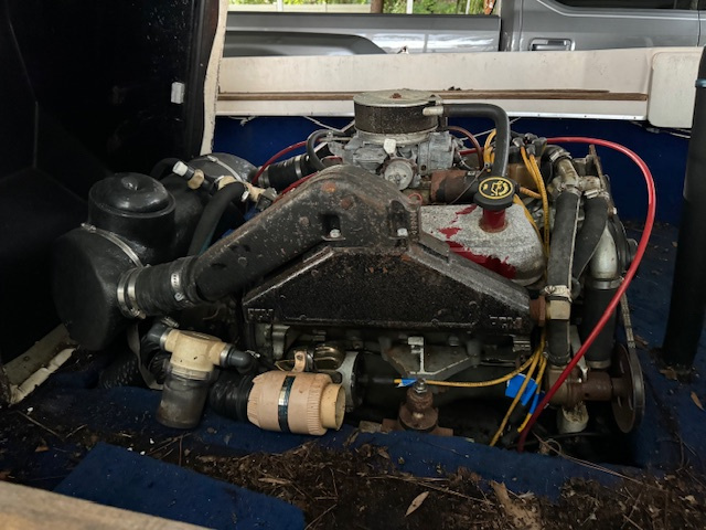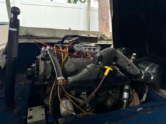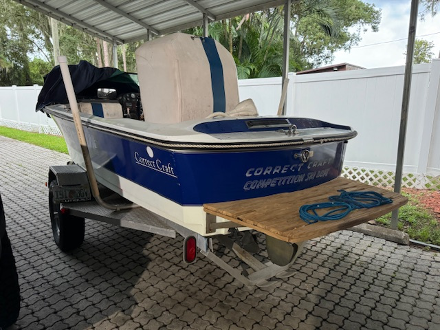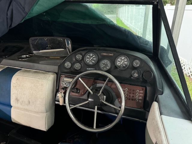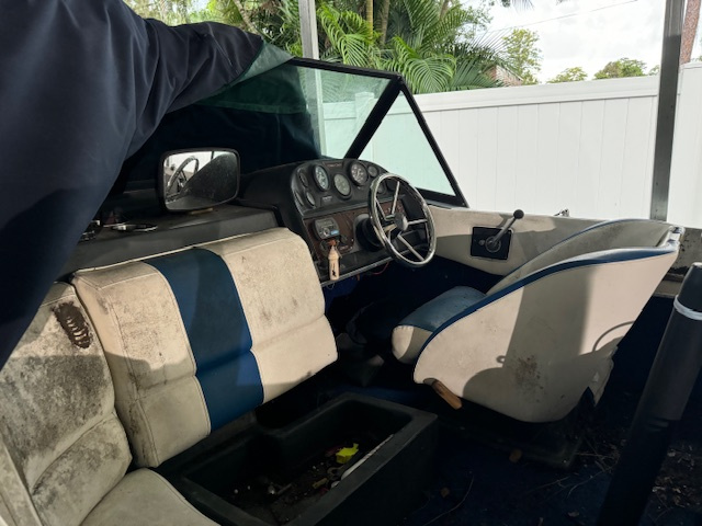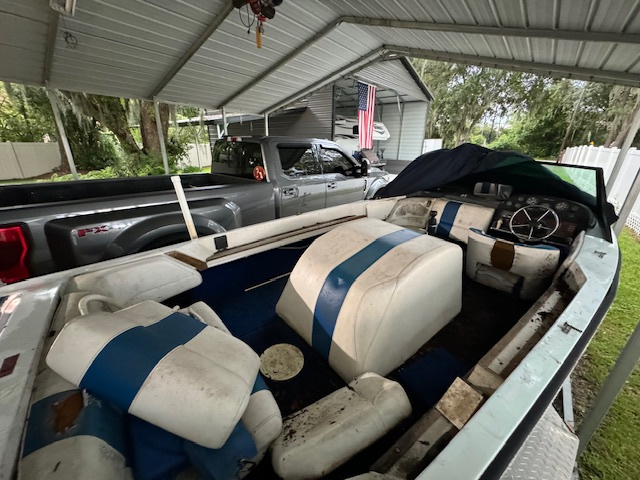 This is an extensive project boat. Boat has set outside for several years (with canvas cover mostly on). Floor has some soft spots around observer seat, interior vinyl will need redone and of course the wood bases are rotted. 351 Engine appears to be locked up (Power plus transmission for this year). Unable to manually turn over with crank nut and breaker bar (spark plugs removed). Dash is actually nice with all push button switches functional. Gauges appear to work when power applied. Power gets to starter with start attempt. Exterior of boat is in good condition, and teak platform although showing wear, cleans up nice. All teak appears to be with boat. Rudder/strut and prop appear to be straight and un-damaged. Trailer is in overall good shape and surprisingly, all lights work with exception of two by one fender. Tires were flat and were exchanged out for used actual 10 ply trailer tires. Trailer rolls well but I would probably want the bearings repacked for any distance more than 10 miles. Bearing caps removed and bearings seem to have no play. Tongue jack is manual crank and works. There is no title with this boat as original owner lost it and never applied for new one. This boat has been on a private lake in Orlando at least the last 20 years. the canvas cover is a snap cover, to the rubrail and is weathered but still could function as a storage cover. There is a matching bimini that seems to be in good shape. Again this is a major project. I am not a certified mechanic or able to fully assess if stringers are good or not but drain plug was not left in and no water was in the boat/bilge. This will be an as-is sale.
