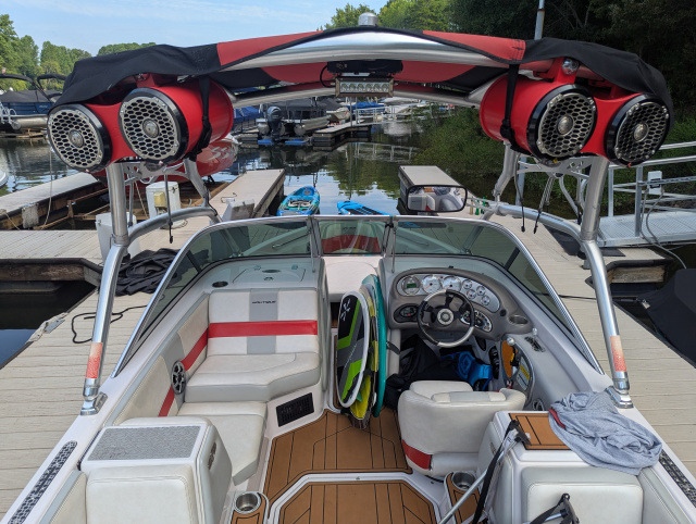 * While the boat retains its stock Clarion deck and Polk interior speakers, the Polk tower speakers have been upgraded to 6 1/2" Rockford Fosgate speakers, and their canisters have been powder-coated red to match the boat's color.