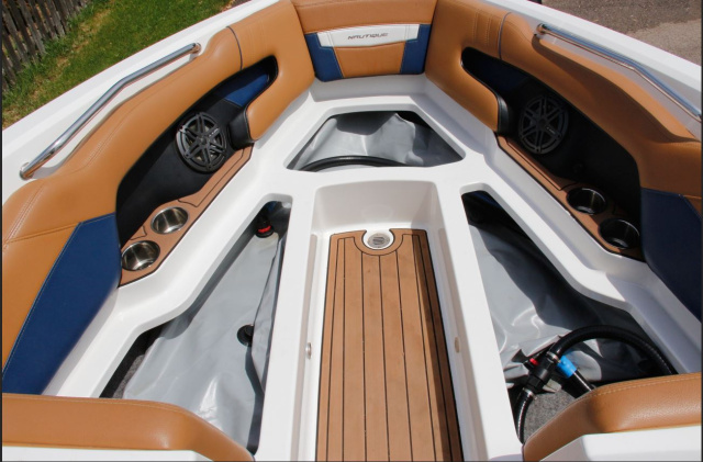 This SAN 230 coastal edition features the H5 direct injection motor which gives slightly better torque than the base ZR4 motor with improved fuel economy. As Nautique’s former flagship model, you get solid surf and wakeboard waves without the hassles of a heavier boat. Beginner riders enjoy the easier wake transitions and advanced riders get plenty of pop for wakeboarding. This boat also has plenty of push for wakesurfers. This 23 ft. boat has seating for up to 15 people, there is ample room for a fun filled day out on the water.