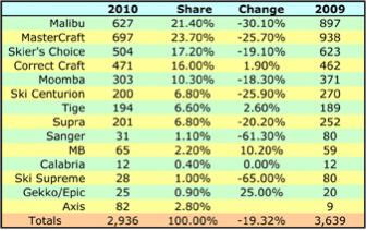 MSRP has never meant much when it comes to ski boats. I would bet that CC looked pretty hard at what MC posts as their MSRP and kept theirs under, thus promoting price and quality. Other marine segments have rebounded somewhat from last year but for ski boats they remain in the tank. I wouldn't expect posting MSRP's to change that but I applaud them for a least trying something. Anybody know if Malibu lists their MSRP's? Numbers on the attached chart are pretty depressing when you consider that 08, not a really great year, saw MC/MB in the 1300 unit range and CC just over 800. I personally don't see much happening until housing/employment gets back on its feet hopefully by 2014.