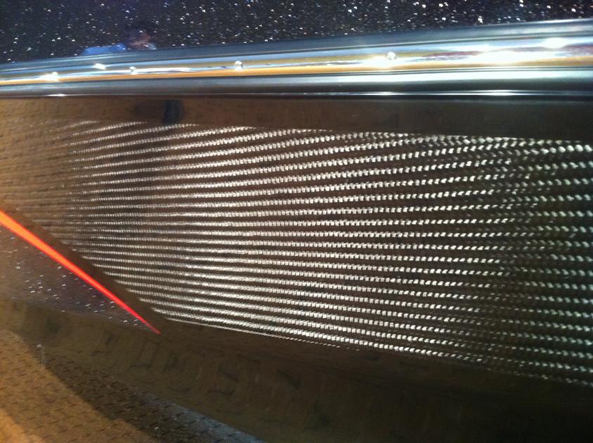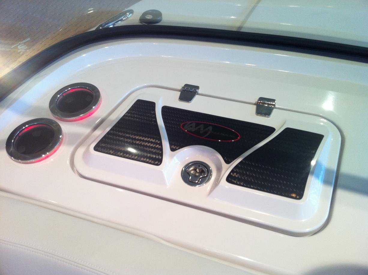 The carbon fiber is NOT a sticker. It is in the side of the boat, with clear gelcoat on top. Same with the glove box lid.