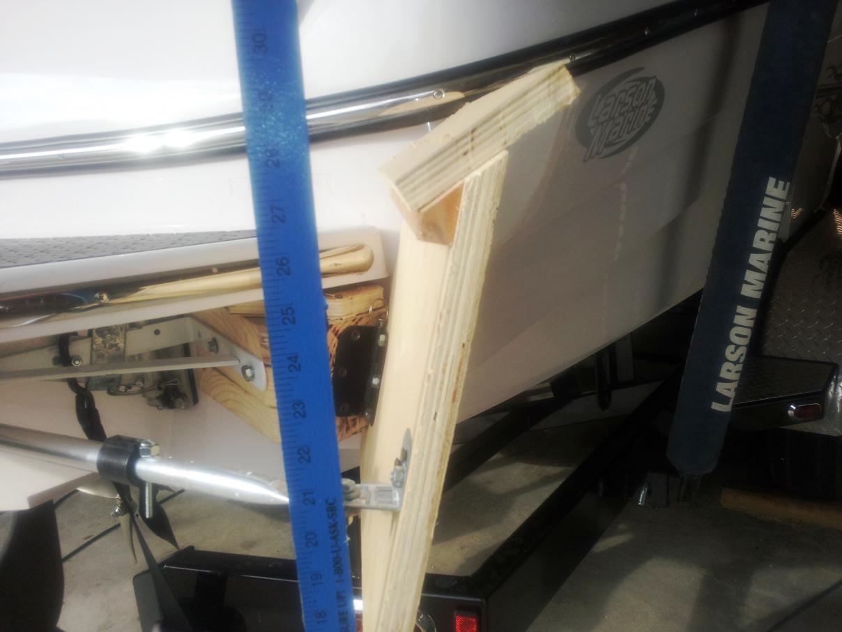 As for the angle, I have included various pics. If I had to guess, I would say the angle of the tab is ~135 degrees from the hull. The blue yardstick in pic 2 is roughly perpendicular to the hull. When the setup was in the 2nd hole it was probably ~140-145 degrees from the hull. Also, I thought the tab was vertical, but in pic 3 you can see that it is tilted about 20 degrees (the yardstick is vertical and the camera is tilted slightly). In pic 4 you can see the position of the tab is behind and at the same depth as the one chine and roughly the same angle as the hull and goes all the way up to the rub rail.