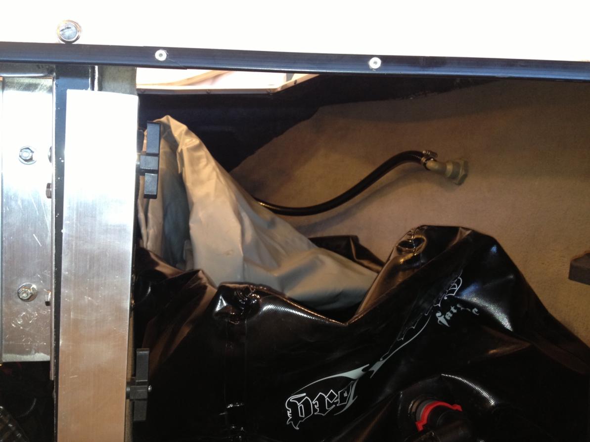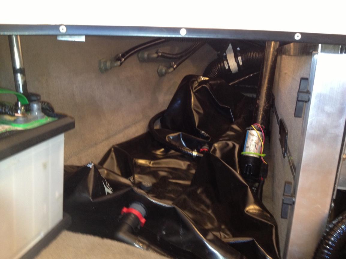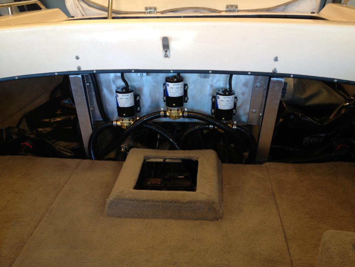 It is a basic ballast upgrade--3 sacs and 3 ballast puppies. I used two black 750 lb sacs in the v-drive lockers and a black rear seat sac in the ski locker. I drilled two 1" intakes for the v-drive sacs and used the existing 3/4" intake for the ski locker sac. But I used a 3/4" to 1" fitting on the ball valve so that 1" hose feeds the sac. I also drilled a bunch of holes in the scoop strainer on the factory intake thru-hull.