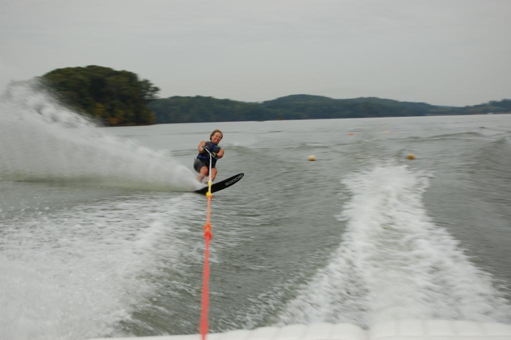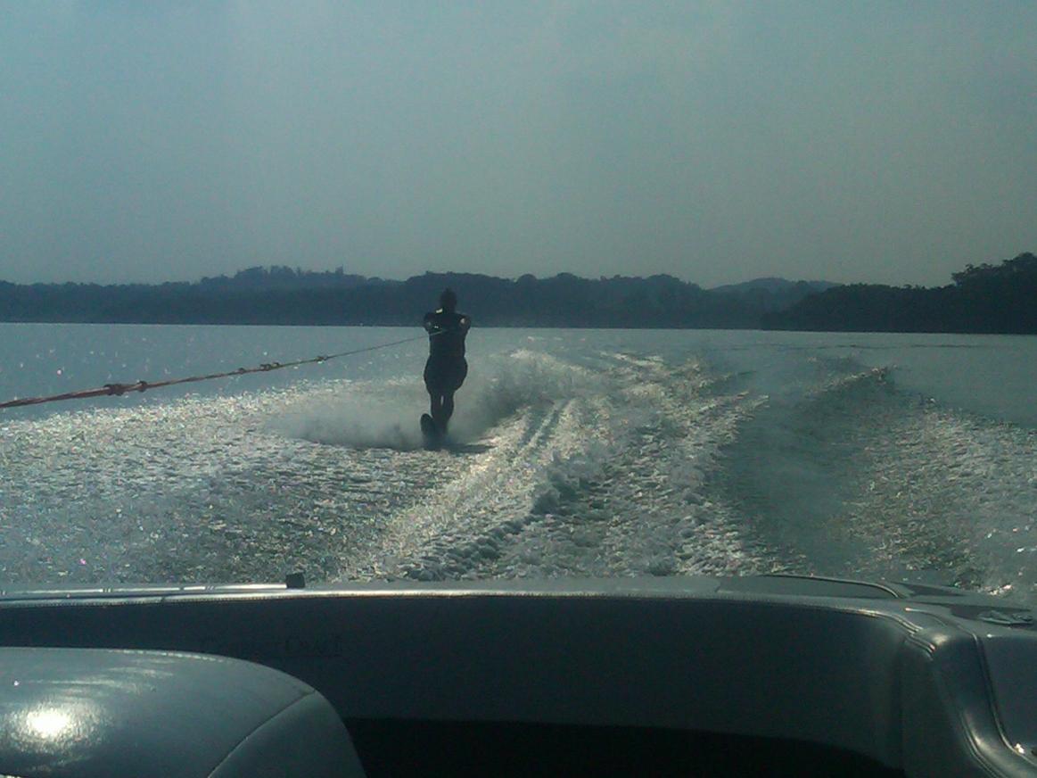 ID:	365509THIS REPLY IS TO NCH2oSKI. Comparing pictures between the sport and the sunsetter lx. This picture is 7 years old, and a pitiful wake crossing, but it gives a good idea of the size wake at 30 mph 15 off with my 120 lb wife and a 215 lb son in the boat. The wake is smaller at 32 and 34. At 22 off, the wake had a slight bump, but still not too bad once I started getting on edge through the wakes. It looks to be more of a rounded hump than the sport...which seems to have a defined wake with the twin roosters washing out toward where you were skiing. I would guess the wash is softer than the hump of the sunsetter. What length were you skiing?