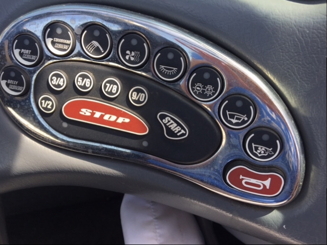 To test all the buttons on the keypad, belly ballast button will be for trick tank if it has one, press once (solid light) to fill, press and hold (blinking light) to empty, other 2 ballast buttons not used, shower on/off, heater each press is low-med-high-off, aux lights under gunnels & dash on/off, nav lights press on (solid light) press hold (blinking light) anchor light only, blige and blower on/off.