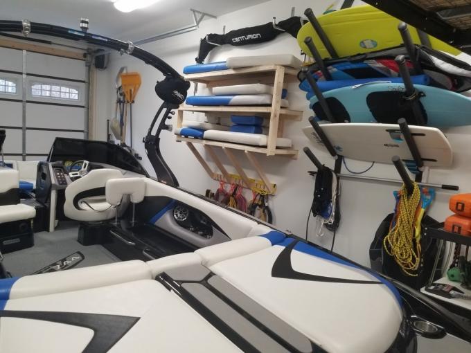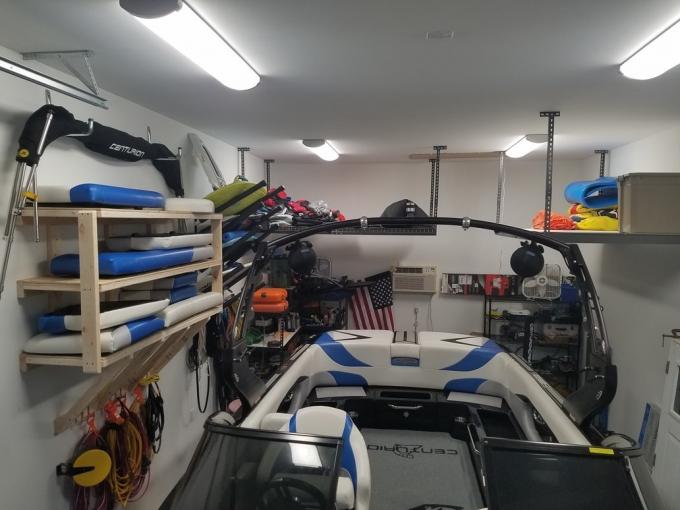 I wanted to be able to bring the boat home from a day on the lake, and from inside the boat, remove everything if I wanted to without having to climb in/out of the boat. Same for loading up, so I can choose what surf boards, kids toys, etc.....that we want on the lake that day without getting out. I usually remove the seats to make sure the boat dries out and I never get any mildew or wet smell....so I built 3 wood racks on the side for the seat, and 2) 4x8 metal racks that hang down from the ceiling 42". This allows me to reach all the main things for the boat by either standing on the gunnels (I installed decking on gunnels for grip), or standing on the rear walk-thru transom. Then I also added as many metal shelving units at rear that I could (have 3 installed so far) those are for tools, boat supplies, oil change equip and all the other fun stuff....and am putting a "Gladiator" wall system up to hang things like rakes, shovels and other misc. On left wall, I still have 8 of those to install which will finish filling up that wall.