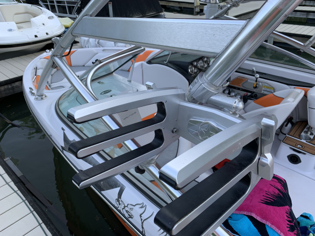 First pic from the transom is not my boat, but shows the PTM tower clamps and racks. Their clamps a very "trick" in the angle on the mount area can be adjusted...2nd pic is my setup on the Titan tower clamps. If I can figure out a way to get the Titan swivels to release from the bottom that would make them easier to use.2008 230 TE-ZR6
