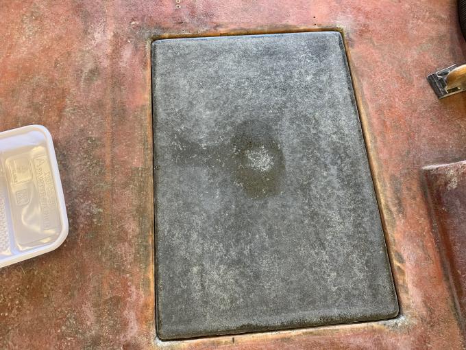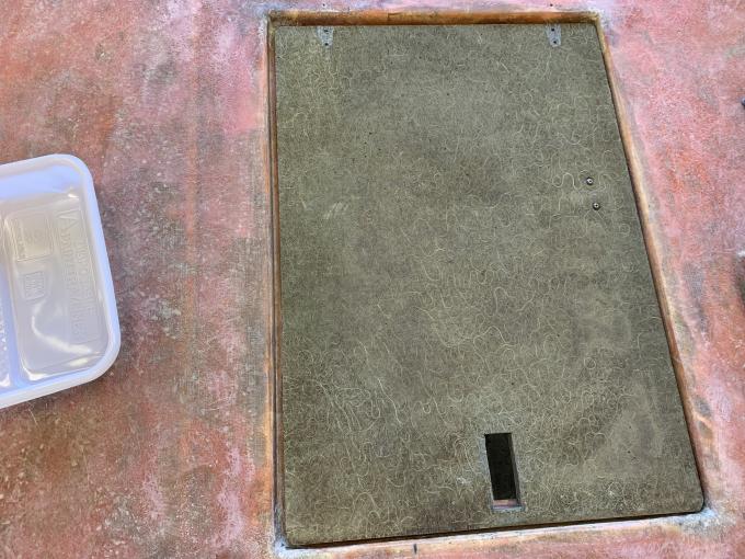 Got the belly hatch made finally. Just need to cut the hole for the latch. So like I mentioned in last years post when I started this part of the project I made new hatches rather than build up the original ones. Used thicker coosa board and cut it slightly bigger in length and width to take up gaps that were needed for the carpet. What I also did was wrap these hatches in fiberglass. My thinking is they will be less likely to bow over time from being stepped on and will make them more durable from dents or anything that might get dropped on them. Plus the gel coat should go over fiberglass not coosa foam board I imagine. Going to repeat the same process for the fuel tank hatch and the bow floor panel which is also coosa board. Below is the original belly hatch so you can see the gaps and how it sits lower than the rest of the floor.