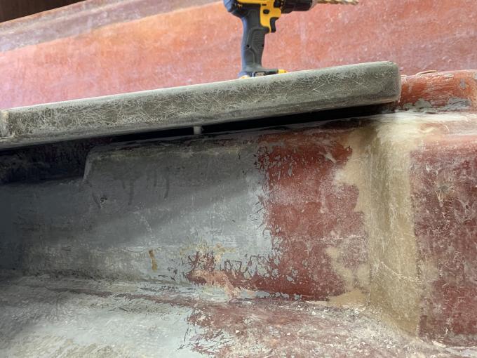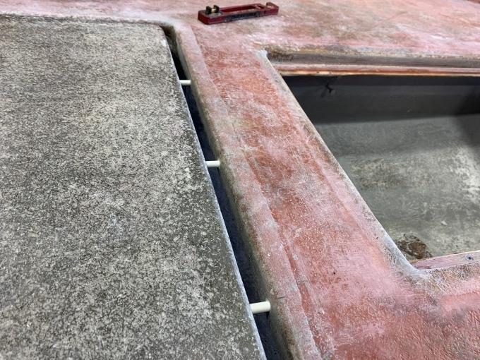 Came up with a “fastener free” way to attach the gas tank floor panel and it’s pretty solid. Started by bedding the floor panel to the hull with thickened resin so the panel has perfect contact with the main hull stringers that it rests on. Next installed 3/8” fiberglass dowel pins in both the front horizontal and rear bottom vertical orientation so the front pins keep the panel from lifting up and the rear pins keep it from sliding back. To remove the panel I will just raise the rear seats pull up the rear of the panel and slide it back to get to the gas tank. Once the panel is gel coated I can put the seadeck on it and not have any screws showing.