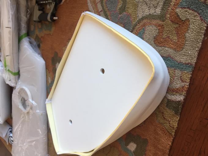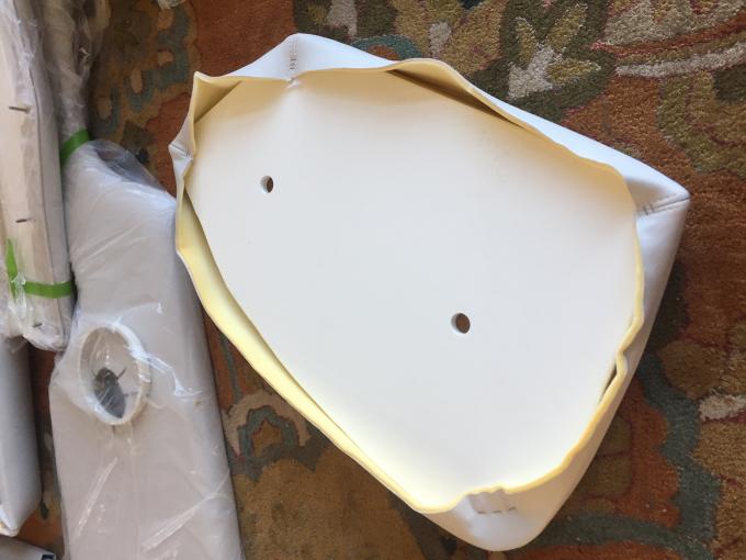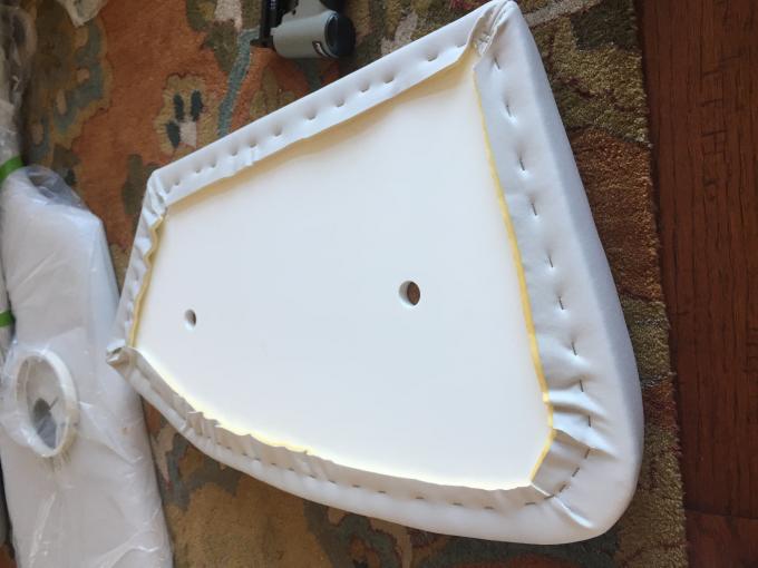 Back to the seat base repair to finish that process for the thread here. This is a different piece but I did the same thing to this bow seat in replacing the base material with the stronger king starboard. This one wasn't broken but because I had to do the port side bow seat I figured I'd do the starboard as well just as preventive measure. (Note: the bow center seat and bow filler are both made with a different material called Coosa board which is much stronger and reinforced with fiberglass so those are rock solid and I'm not worried about them) Once I finished shaping the seat base I used an aerosol glue by 3M it works great in securing the foam to the seat base material and also securing the plastic wrap to the foam. The plastic wrap is there to help the vinyl slide across the foam when you stretch the vinyl over the piece it's not for water proofing the foam which is what I first thought until I read the Christine's vinyl install instructions and learned the real purpose of the plastic wrap.