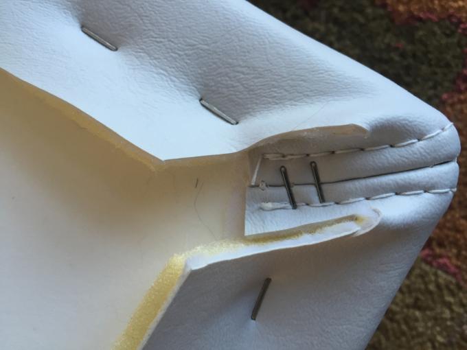 After the skin is on most of the seats except for the bow backrest and combing pads will need a backing which is a breathable material for looks only I think. I start by finding the straightest longest edge and tack that down first. note: you don't needs bunch of staples here because the next piece that goes on is the hidem I think it's called and it goes on the same staple line that the backing goes so basically you will be securing the backing in the next step as well so I allow 1.5 - 2 inches between staples when doing the backing.