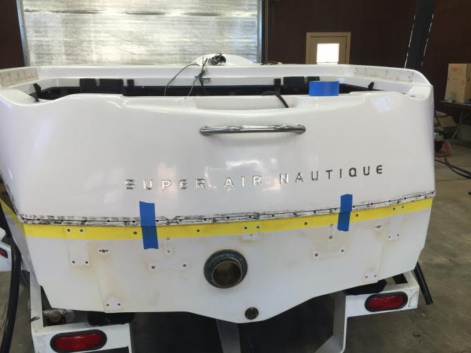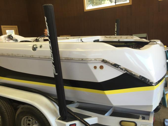 Before carpet goes in I figured I should do all the gel coat work so I'm not slinging polish and gel coat sanding residue all over the new carpet. I'm trying to follow NautiqueJeff prep process by removing all the external hull components so I don't have to work around rub rails, swim deck brackets, windshields,ect. I'm getting rid of the black plastic cups on the transom that cover the lift rings because I want to use those life rings as a tie down point for the trailer tie downs and I'm replacing my swim deck with a new one that does not have the cutouts for the lift rings because again I feel it will look cleaner and I always trailer my boat and never use boat lifts so I have no need for the swim deck cutouts. Also the old holes for the pitot speedometer pickups because they are not used with the speedo/tach replacement gauges or the perfect pass so for a cleaner look I'm going to be plugging all these old holes on the transome with fiberglass resin and then gel coat over that so those holes will all disappear. I will be using the spectrum gel coat patch kits that are available on nautique parts. Also will be filling all the bow cover snap buttons which I removed because I have never taken the time to use a snap on bow cover in my life and hate the idea of hauling around a bow cover in my boat that I may use once in a blue moon if at all.