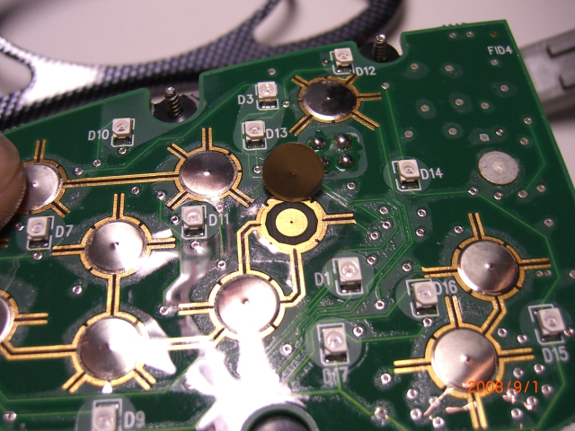 The start keypad still can use for some time , notice the '4' bad contact becomes worse recently, take it out and disasemble for inspection, found that is a PCB have IC on it , ,button side is clean looks not bad contact there,water oxidesing can be seen at the edge of parts side, means its not serviceable since this side are sealed with epoxy. some water goning from the sealed edge into inside of PCB and corrode the circuit,the photo shows a clean botton side. ' need more try to fix the '4' problem.