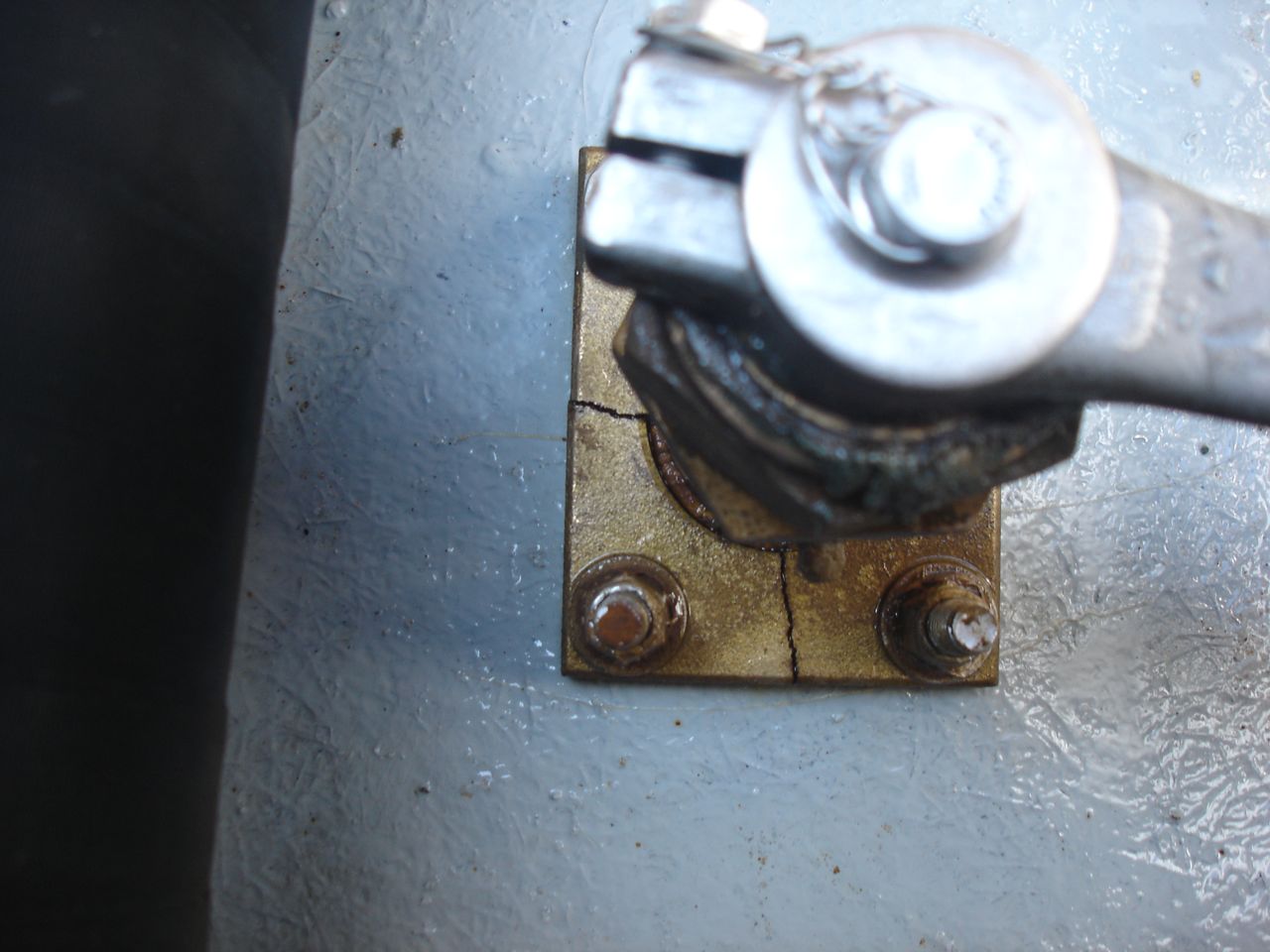 Pulled our club 196 for it's Labor Day clean up. Removed the floor in the back locker and somebody noticed that the backing plate for the rudder assembly is cracked in 3 places (see photo). There is a piece on the opposite side of the hull that looks perfect. Never hit anything or had any work done on the rudder, shaft or prop.
