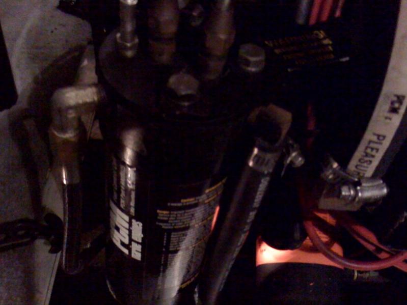 There is also a high pressure fuel pump, it is inside the FCC, and inside a fuel filter. The pump and filter are about halfway up, inside the FCC, to allow any water in the gas to settle into the bottom of the FCC, and be drained out by the drain plug on the bottom of the FCC. The high pressure pump supplies the fuel rail, that feeds the eight fuel injectors. There is a pressure regulator on the end for the fuel rail, that bleeds fuel back into the FCC, maintaining the correct fuel pressure. This fuel may go back to the tank, or back into the high pressure pump.