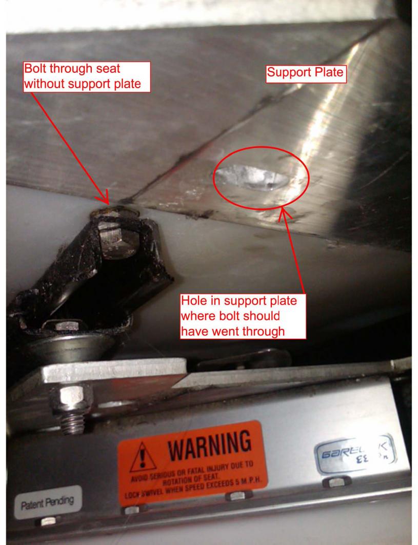 While preping the boat, I noticed the drivers seat support plate was sticking out from the bottom of the port side... Upon further investigation it looks like they missed the bolt hole on during the original install. The boat is still under the 5 year warrentee but I planned on just fixing myself until I realized I didnt know if it was a "thru bolt" connection on the seat (where I would have to take the skin off to get to the other side) or if it was a "lag" type connection... On the side that looks correctly installed it appears that there is a bolt that goes through the black sliding base frame then through a nut then through the aluminum support base then into the seat... Any ideas on how this connection is made (I prefer not to deal with the skins if its a thru-bolt connection)...