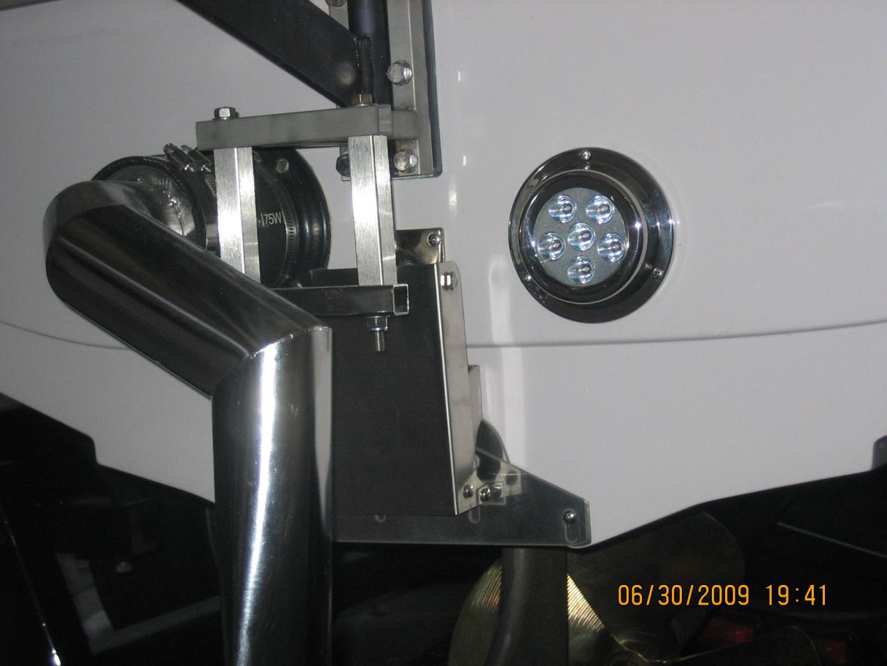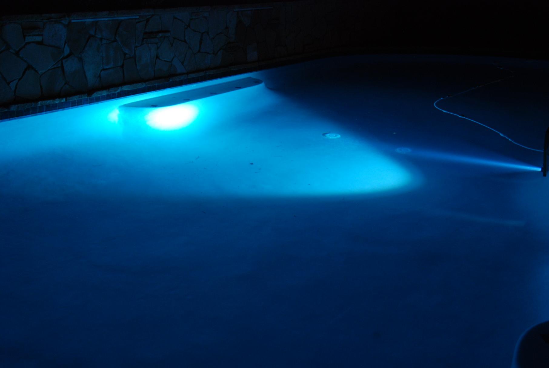 I have a Bullet X8000 light that I pulled from my boat and replaced with a shadowcaster (wanted a wider beam spread). It is blue, a $300 light that has been sitting on my shelf for over a year, I will ship it to you for $100 if you want it. I had it mounted opposite the exhaust port. It is very very bright but the beam is a bit narrow. Hit me up at mikeskiw@gmail.com if you want it. Here is a picture of it on the boat and one of it in my pool before I installed it.