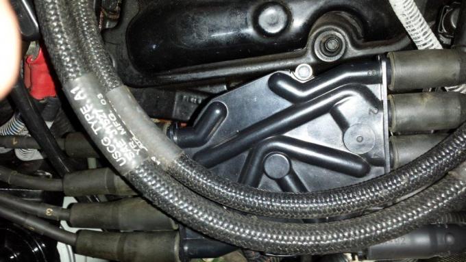 Second was a right angled fitting bolted to the front of the engine next to the harmonic balancer.( see picture )