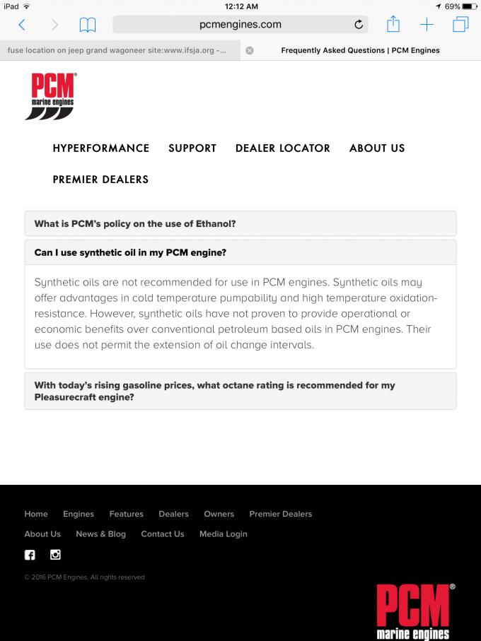 PCM has never recommended synthetics. Not to say you can't use them, but apparently there is no advantage in boat engines which run cooler than car engines and rarely get used in extreme cold weather. They just cost more with no proven benefit.