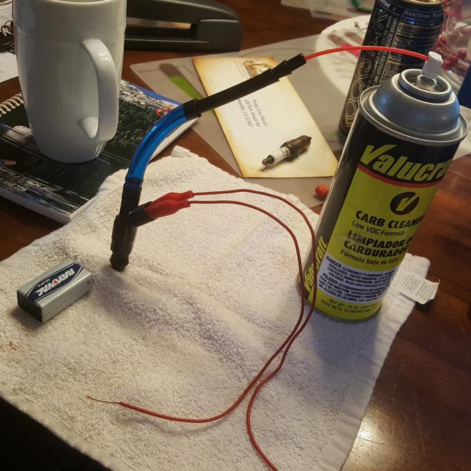 You can bench test if you can rig up a way to pressurize with fluid spraying in to a glass jar or similar. a 9V battery will trigger if you can find a way to energize with a suitable harness plug.
