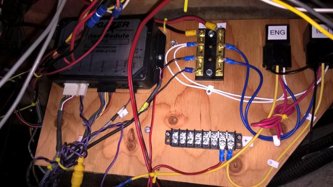 The fix was to build two new switched circuits - one on with the ignition, one on with engine - with associated busses for hot and ground. I mounted the new panel under the dash by gluing some wood strips to the ventilation box and then screwing the new wood panel to the strips. Power and ground are taken direct from the battery with a large 10 gauge cord.