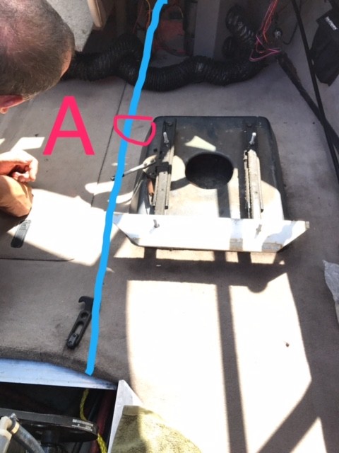 We spent 2 full days this weekend trying to replace the steering cable on our 1997 Sport Nautique / Air Nautique. It's the model with the built in ballast tanks. It was a bear getting to the rudder, but after disconnecting the fuel tank and ballast tanks, we were finally able to access it. Not easy. The BIG challenge where we are stuck is pulling out the old cable. The big silver knob gets stuck somewhere near the driver's seat. See picture A. The blue line shows the path of the cable and the red circled area is where we think it gets stuck. You'll see we even took out the driver's seat. Could there be a zip tie up there? I read that there's a zip tie near the helm. Since you can't reach in there, it makes it impossible to get the big silver knob past this area. Yes, we have tried pulling it and wiggling it from every angle for hours. The only way we can think to access it is by cutting a hole in the side of the ski locker. Hate to cut a hole, but is that the only way? If we have to cut a hole there, will it harm the boat? Hope you guys have ideas WITHOUT CUTTING HOLES!!