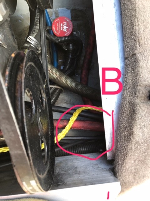 In picture B, you'll see a top down view looking into the engine compartment before everything goes under the deck to the left of the driver's seat. In that space, there is the steering cable, throttle cable, shift cable, 2 tubes for the heater and some wires. The yellow rope is attached to the old steering cable. Is that more than other boats have going in there? Is it just too much stuff? We don't think it's the main issue but throwing out ideas.