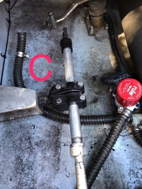 Just as another FYI, see that clamp with the four bolts there in photo C? Do not loosen that clamp or take it apart. There's no need to. That clamp adjusts the rudder throw and you have to know what you're doing to adjust it properly.