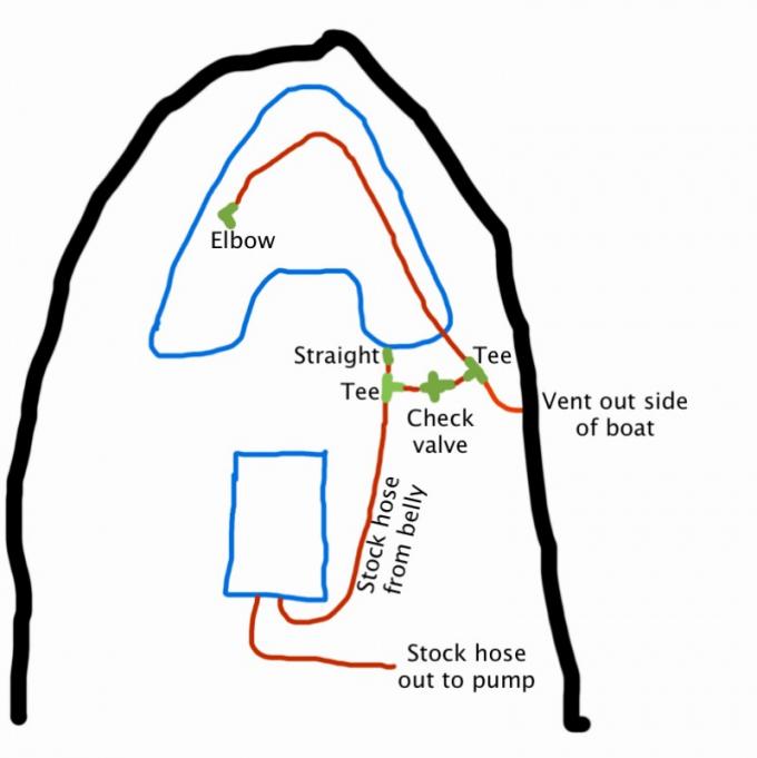 I'll be at the cottage in the next couple of days and I can grab some pictures, but you are essentially adding a tee directly before the overflow inlet to your bow bag. Then another tee as close as possible to where your overflow vent line from the top of the bag exits the boat. Between those two tees you you put the check valve. In my 210 the overflow line comes out from the belly tank under the helm really close to where the vent opening out the side of the boat is, so my check valve line is only a foot or so of hose to connect them. Then I just made sure my overflow hose from the belly tank and vent hose from the bow sac were short enough that they didn't have any dependent loops in them to trap water and prevent the bag from venting when filling. And like I said, the only issue was some water left in the bag when emptying, but I think its just because it was hard for water to flow back into the belly thank through the elbow on the bag, hopefully the straight adapted will resolve that issue. The major key is if you have any extra hose trim it instead of letting it coil or loop, the straighter all your hose is the less chance it would air lock and keep the belly bag from venting properly, the check valve takes over once the empty bag cuts off your vent to the belly tank.