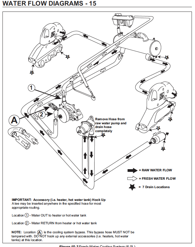Late to the discussion, but it's also my first year with a ZR6 with the same closed cooling system and optional drain kit. Here are the water flow diagrams from the owner's manual so that we can all be on the same page with what's being discussed. The first image shows the closed cooling system and the seven plugs that need to be pulled to drain the raw water portion of the system. The fresh water portion of the system is anti-freeze so no worries there. The second image shows the optional drain kit referenced by the OP. The plugs have simply been replaced with hoses that lead to the front of the engine. In theory, pulling that one plug allows the entire raw water system to drain. I did a simple test of the drain kit over the weekend. I drained the raw water flow using the kit and then double checked at the seven plug locations to see if any additional water came out, and it does appear to be effective with one exception which is the plug marked "7" in the first diagram below. So in theory, to completely clear the raw water system, you would need to pull the drain kit plug and plug number 7. A crank or two on the engine to clear the impeller of water wouldn't be a bad move either. Is my theory sound? Any thoughts?
