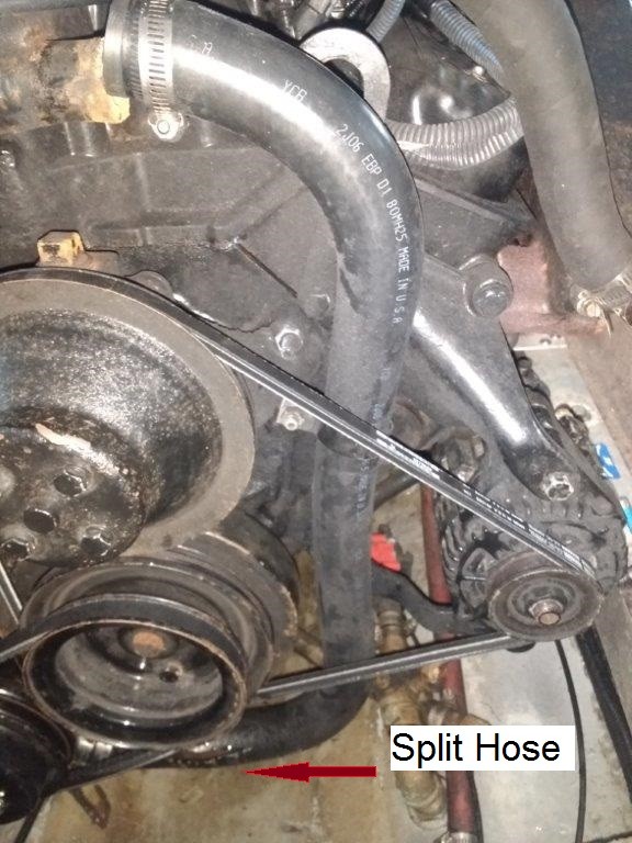 We were doing some footing on Saturday (long line and Boom) when on the last run of the day I was coming around the corner in my 2003 Nautique 216 when I noticed the change in exhaust noise. The kind of change that happens when it is being starved for water. Slowed to an idle and saw the temp gauge start to climb, popped to engine box to see water sprayed all over and standing pretty deep in the bilge. Then noticed the 3" split shown in the picture. Of course it is a formed hose and the local marina's didn't stock it. The good news is I was able to find a hose at Farm and Fleet that would work just fine while still providing the clearance as the formed hose. It did take some time getting the system to finally start drawing water again (ended up removing every fitting of the raw water system and blowing it out) but I think part of my reason was I was just letting it idle to prime it self which wasn't drawing any water, once I actually gave it some throttle it started drawing right away. I did order a new formed hose to have as a back up but the hose we put on seems to be doing the trick