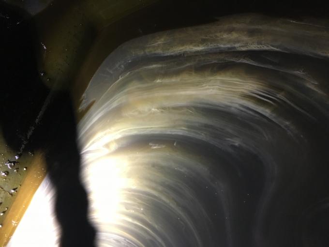 Today I serviced the boat before hibernation. Before I did, I checked the oil on the dipstick, full, clean and lacking odor. Good. When i pullled the drain hose cap, the oil was laced with a yellow streak indicating, based on my experience, water in the oil. It wasn’t completely milky however it left a significant lace streak while draining. See photos.