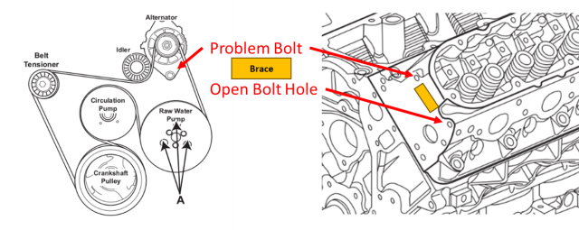 Earlier this year I shredded 2 serpentine belts before realizing my alternator bolt was sheared off in/at the block (2007 ZR6). I replaced the tensioner, idler and raw water pulley prior to this realization. After getting the rest of the bolt out, I needed to rethread the block. This didn't go completely as planned as my EZ Lok thread insert had a tiny bit of play after inserting & a 3 day cure. In order to fix this, the block will need to be filled & rewelded as there is no room left to bore a larger hole.