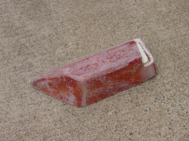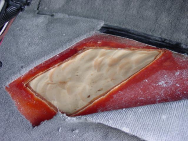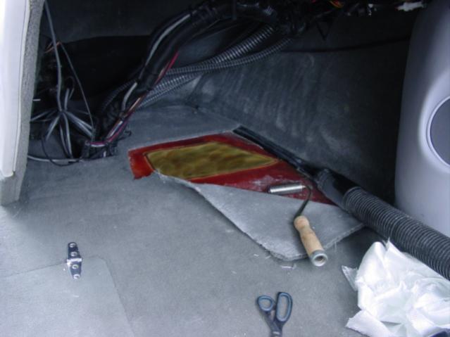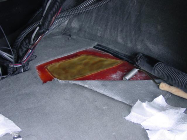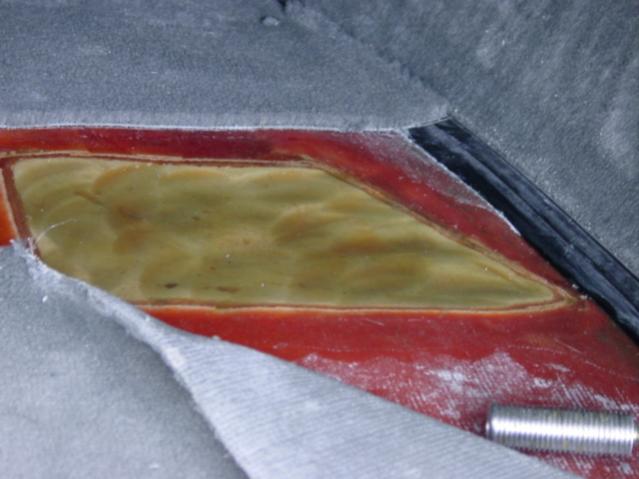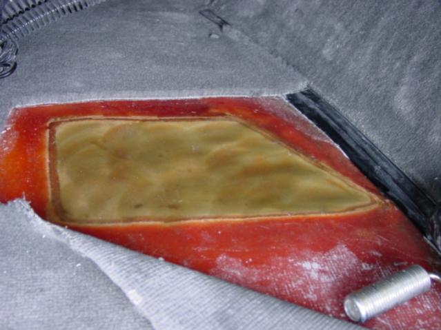 Step Six: (actually shown in step five photos) Lay down four layers of fiberglass cloth, fully saturated with polyester resin. (I called my dealer to find out whick resin is correct to use, and they said use a high quality polyester resin, not epoxy)