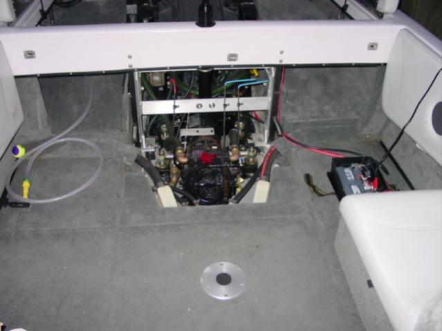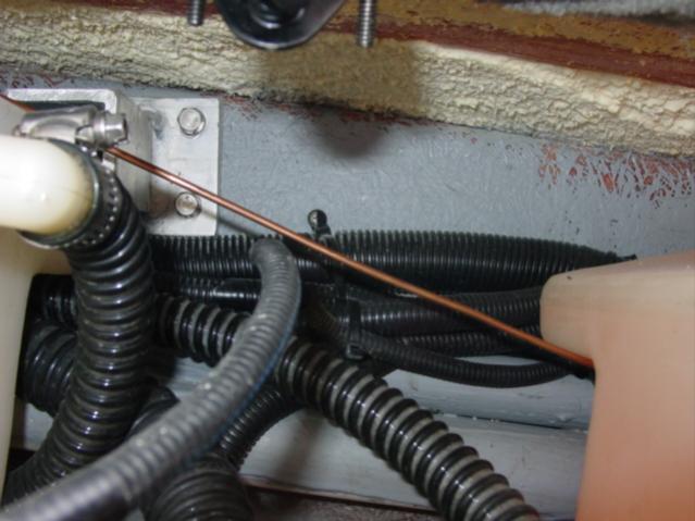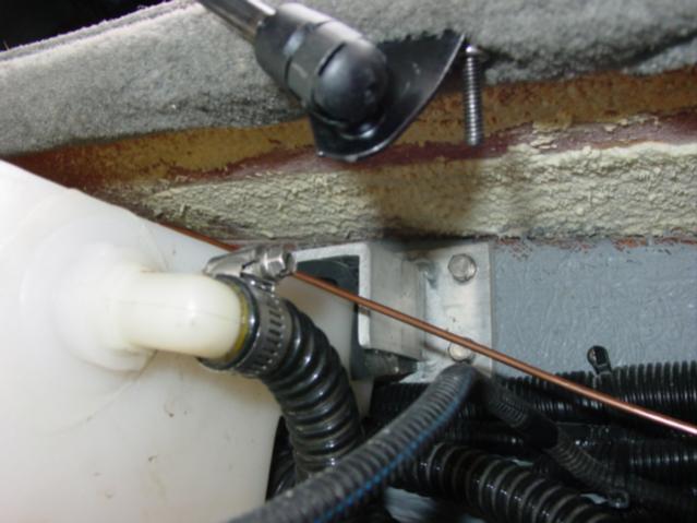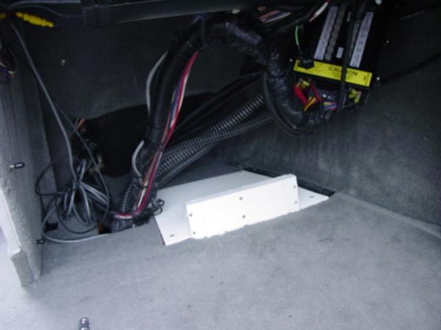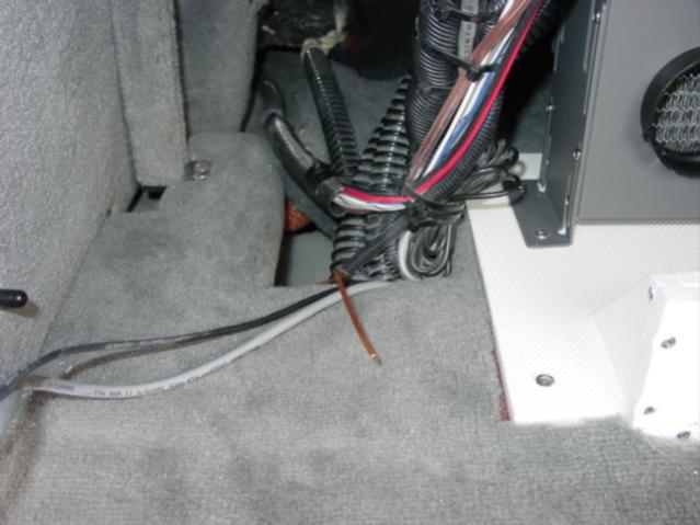 First, under the floor, fish a line from rear of the boat up to the port where the wires and water line come up behind the dash. I found it easier to run a stiff wire (copper grounding wire). I started at the engine, and ran it under the "lip" of the gas tank on the starboard side. I then ran it on top of the center ballast tank between it and the floor. Then the wire was fished up behind the dash. That is where I stopped for today, so I will snap photos tomorrow.