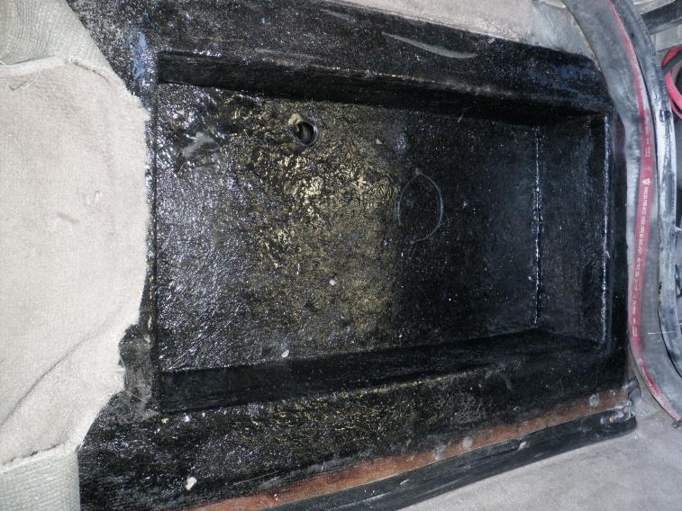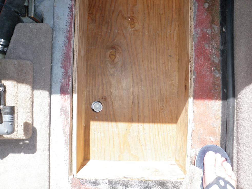 5. In order to give a bit more support, I built a wood box that fit in the cut out that I eventually glassed over. I connected a drain into the bilge using 1/2 inch PVC pipe so water wouldn't pool in the box area around the batteries.