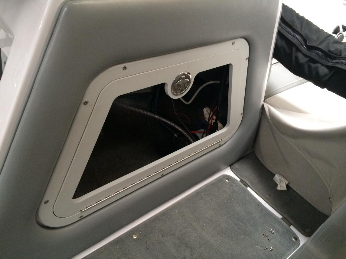Most of projects I have seen for venting the subwoofer area in mid 00's to early 10's SAN's have been for boats that were not optioned with a cooler access door. I suppose you get the same effect by simply opening the door if you have one. But I got sick of leaving the door open and creating a tripping hazzard in the walk-through, so set about a way to vent the door itself. Of course I could have simply taken the hole saw to it, but that would have created an eye sore.