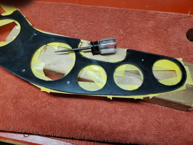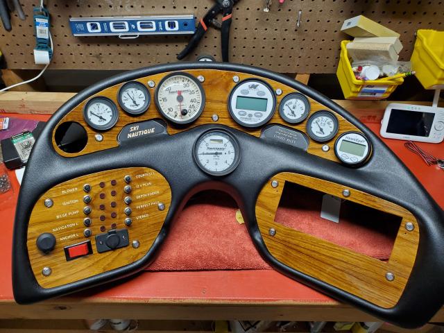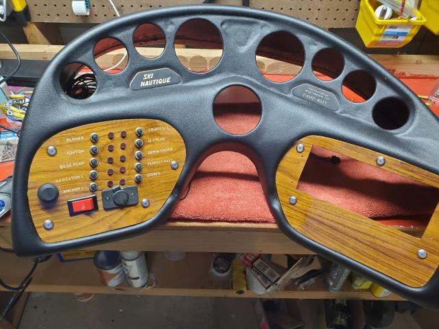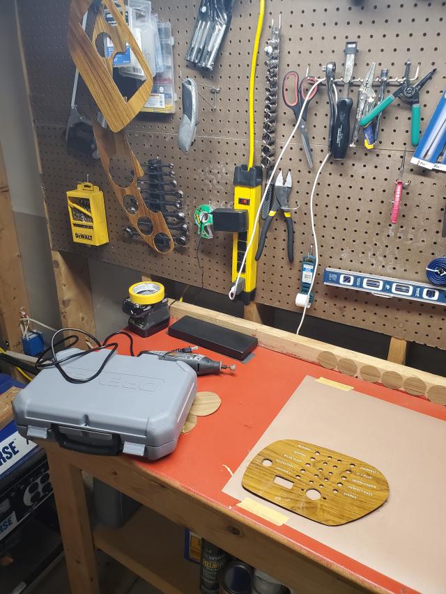 It's officially varnishing season on the west side of Lake Norman. I finally finished cutting out and applying veneer to the gauge panel. It was more tedious than outright difficult. I trimmed the veneer with an exacto knife while cutting from the back (plastic) side. The veneer side sat on top of a towel to both prevent damage and give the blade somewhere to be. After the rough cut I honed it in with the sanding drum on my dremel.