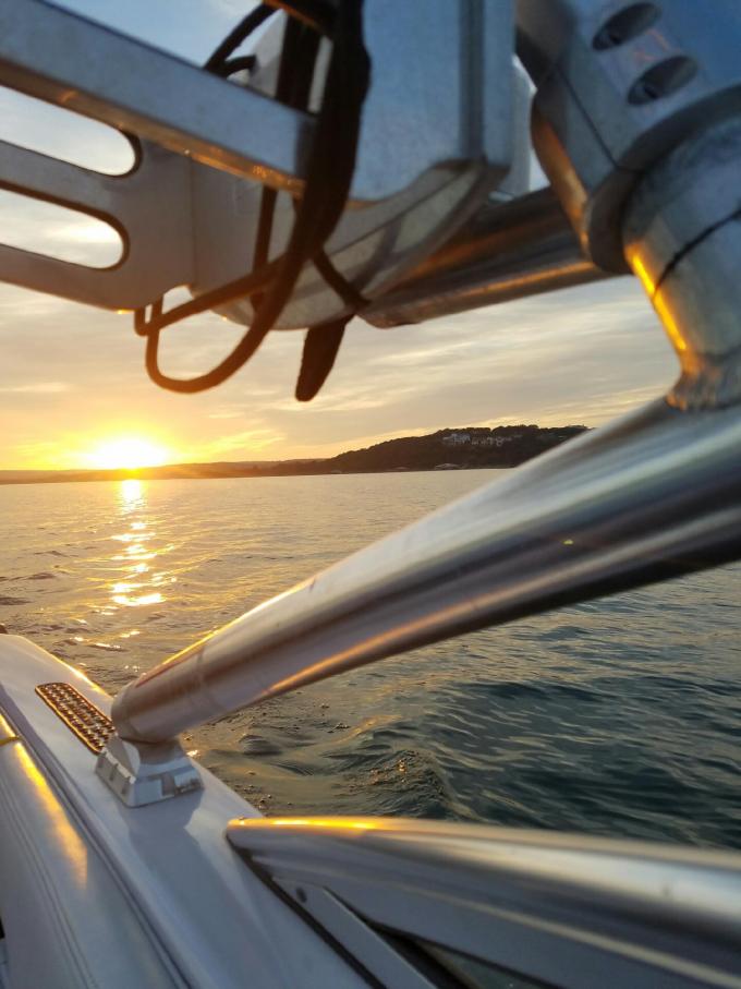 while it it was out of the water i installed three power LED underwater lights. 6000 kelvin temperature color, as bluer light travels farther in water than white green or red. two 500 lumen spot lights under the transom towards the outside. and one 2500 lumen flood light hooked up to a pitch adjustable lever so i can aim it up and project across the surface or point and down and light up the lake. threw a k&n spart arrestor on the motor with an amsoil waterproof prefilter and gave her some 10w-40 amsoil marine oil.