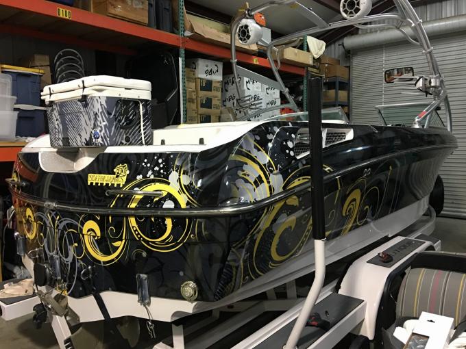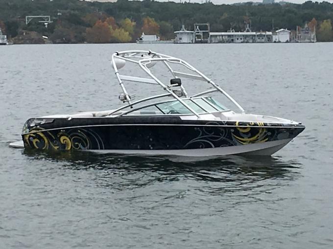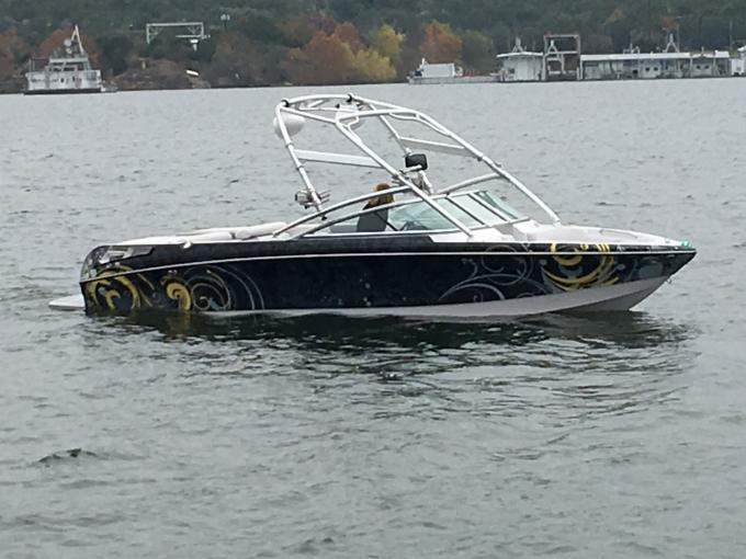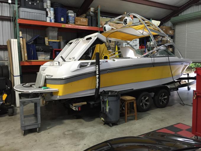 picked this boat up last summer in july, pulled out of the water in august and went to town on it. spent wayyy too much time and money trying to get yellow gel coat to match. took out the stock radio, added a din pocket there. bought the JL Audio mm100s and five pairs of mx650s. three pair in the stock in boat locations. one pair near drivers seat low and jump seat. another pair in the bilge access back wall. JL media master was place where factory remote formerly was. a pair of rev 8" on the tower. 12" ported sub box with custom silver cloud paint job. four amps total for three separate zones on the JL head unit. JL a1800 mono block sub amp driving 800watts rms on the sub zone. zone two is tower getting 200w at 4ohms to the rev8s. remaining two amps power the five in boat speakers. 1 four channel amp and one 6 channel. it will blow your ears off. mounting the head unit and drilling holes in the fiberglass were the most difficult aspects of the install. wiring took a while too. JL remote is in port side blige access conveniently tucked out of the way or elements, rain, sunlight and accidental song changes.