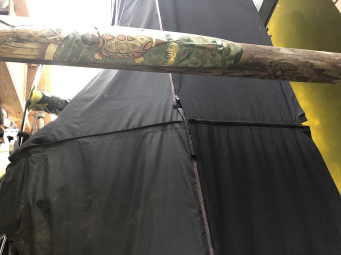 I had a canvas shop put heavy duty zippers around the bottom of the factory cover and then made 2 big U shaped skirts. One goes around the front, the other around the back. They mate up where the factory cover splits so I just unzip those 2 extra zippers in the middle and roll it up like I would the factory cover.