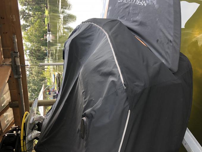 It’s simple in theory, but with a GS 20 it’s difficult for one person to do because you have to get the cinch strap pretty tight so the skirts don’t fall out under their own weight. However, tightening the cinch strap makes it hard to stuff the side skirt in above the rub rail especially where the hull angles in near the bow.