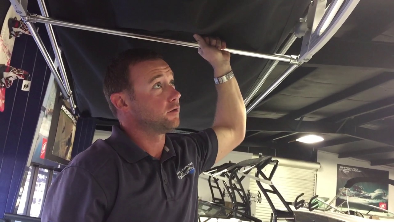 I bought a 2014 G23 that came with the flight control tower and bimini. When folding the tower down, Im having a problem with the bimini frame (where the threaded knob goes through) scratching the windshield unless I have a person in the bow strictly for holding the bimini off the glass. The only info I can find is this video showing the tower folding process on this tower and this guy lets go of the bimini and it holds itself up. Is there a part I'm missing on my bimini or do I have to find a way to add gas shocks to keep my bimini off the windshield? Here is the video im referencing at the 1:30 mark